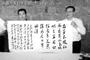 图为汕头市作协秘书长郭勤亮与汕头市作协理事、书法家彭小鹏展示合作的新作。