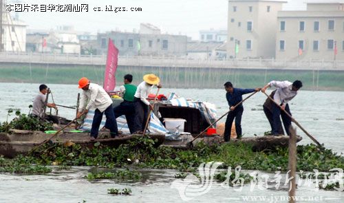 天气渐热,水浮莲疯长,打捞工人忙“应战”。