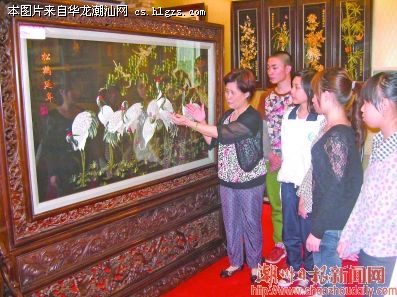 据了解,双面潮绣《松鹤延年》屏风长206cm,宽180cm,是康惠芳及其学生历时一年多创作完成的。作品采用双面垫高的绣法,通过银、绒两种丝线的巧妙搭配以及多种针法的综合运用,表现白鹤洁白轻盈的羽毛和松树错落有致的树枝,给人以高贵典雅的感觉。