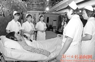 5月8日晚,市人民医院住院楼学术交流大厅内不时传出阵阵掌声和欢笑声,一场为庆祝“5・12国际护士节”技能展示暨表彰大会在这里举行。该院护理人员自编自演了一台丰富多彩的文艺节目,展示了护士们多才多艺的生活。图为护士正在进行护理技能展示。 本报记者 陈宏文 摄