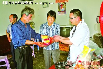 本报讯(记者 刘潮生) “你的血压高一些,心律不齐,给你这些药品,按说明服用,以后情况怎样,你再到卫生院作进一步检查。”这是昨天潮州日报社在市红十字会的支持下组织医师上门免费为帮扶对象林衍舟检查身体的场面。