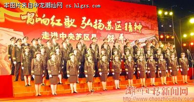 当晚,闻讯而至的群众早早就来到运动场,期待着一睹广州八一艺术团风采。一段激情澎湃的朗诵之后,由广州八一艺术团团长叶爱湘指挥的大合唱《没有共产党就没有新中国》拉开了演出帷幕。紧接着,《南泥湾》、《江山》、《到吴起镇》等一曲曲脍炙人口的红色歌曲,让晚会气氛异常活跃,群众不时喝彩、不时挥舞起手中的荧光棒,现场成了一片欢腾的海洋。男声四重唱《把一切献给党》更是让人联想到那激情燃烧的岁月,饶平儿女无怨无悔跟党走,为了党的事业,不惜流血牺牲的革命英雄气概。演出节目形式多样,内容丰富,精彩纷呈,还有舞蹈《红军鞋》、《一条大河》,口哨吹奏《好日子》等。广东省客属海外联谊会的女声独唱《茶香中国》,饶平教育合唱团的大合唱《党啊!亲爱的妈妈》、《阿拉木汗》也为晚会助兴。最后,演出在男声合唱《打靶归来》、《顿河好汉》的歌声中圆满结束。