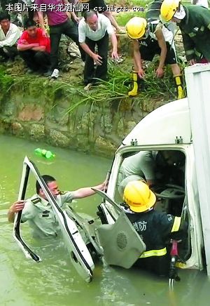 当时一辆小型卡车撞破路桥防护栏,冲入深约1.4米的河中,驾驶员被困于水中货车内。消防官兵首先使用液压剪、铁铤等破拆工具对变形车门进行破拆,然后用手试探性地摸索驾驶员被卡住部位和可以用来扩张的支点,经过20分钟紧急施救,车内被困驾驶员被成功救出,送往医院救治。李伟烽摄