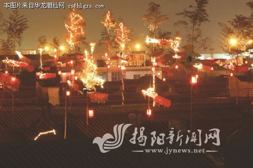 夜晚,灯笼和“彩凤”上安装的各式闪灯一齐亮起,村庄仿佛一座色彩斑斓的灯城。(资料图片)