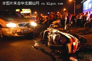 昨晚10时,记者赶到金凤公路与东厦路交界处,摩托车车主已经被送往医院,小轿车车主也不见其踪。由于事发十字路口,来往车辆通行都受到一定影响。记者在现场看到,银灰色的夏利小轿车前灯损坏,车身前包围脱落,部分碎片散落一地。摩托车前挡风板完全变形,车身横倒在地,油箱有明显漏油迹象。在离小轿车后方约5米处,有一双白色的帆布鞋,旁边还有一堆呕吐物。交警正在现场处理,周围有不少市民围观(右图)。