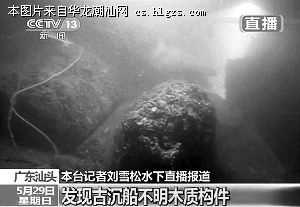 16时06分,央视记者刘雪松下水,他首先来到N10舱。这个舱里有一个迄今发现的最大的凝结物。凝结物上除了有不少瓷器外,还有铁锅和铜炮。随后,考古队员又在这个舱附近发现一处船体结构。它是一个木质结构,两侧有两个木质构件,中间是一个空洞。可以很清楚地看到,空洞里头还有个圆柱状的木头,从手掌丈量的尺寸来看,厚度有16、17厘米左右。