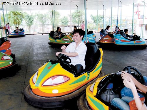 “六一”儿童节,童心未泯的“大小孩”们在游乐园玩碰碰车。