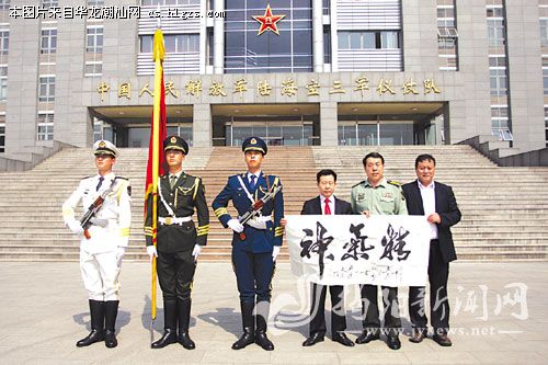 揭籍著名书法家江润初日前应邀到中国人民解放军陆海空三军仪仗队献艺,受到三军仪仗队大队长刘士胥,军中第一国旗手、训练总指挥李本涛等的热烈欢迎(见图。通讯员 摄) .江润初现为“和谐中国”书画院副院长,也是“神州七号航天巡展”题字人。在当天的活动中,江润初与三军仪仗队官兵亲切座谈,观摩三军仪仗队的训练表演,参观队史馆。同时,江润初还现场挥毫献艺,代表他的书风的二幅墨宝《精气神》、《观海听涛》即被三军仪仗队队史馆收藏。