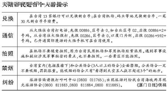 收益:据台方测算,截至今年3月,大陆居民赴台旅游已给台湾带去32.47亿美元收益。