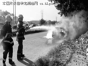 6月6日下午4点多,一辆粤D牌的小汽车在潮阳区一学校附近行驶过程中发生自燃,情况十分紧急。潮阳消防大队接报后,迅速赶赴现场。当时火势很大,随时有发生爆炸的可能。消防官兵用泡沫很快就把大火扑灭。本报记者李伟烽摄