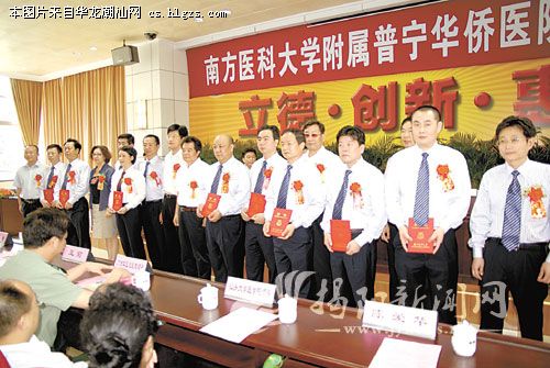 挂牌仪式上,省卫生厅领导宣读了广东省普通高等医学院校临床教学基地管理领导小组“关于普宁华侨医院成为南方医科大学非直属附属医院认定公布”的文件;南方医科大学与普宁华侨医院签署了非直属附属医院合作协议书;南方医科大学聘请普宁华侨医院杜协彬等35名同志为该校兼职教师并颁发聘书(见上图。陈路文 摄)。