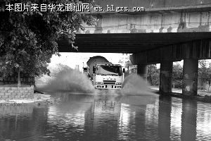 昨天上午10时半,记者驱车沿着磊广大道前行时,天仍刮着风下着雨,但相比早晨的狂风暴雨,雨势已经小了很多。路上只有零星几辆小车经过,鲜见行人的踪迹。在金中南校附近有一处长达几百米的积水,几乎淹盖了由北向南的车道。记者看到,一辆水泥车经过,溅起的水花高达2米左右(如图)。