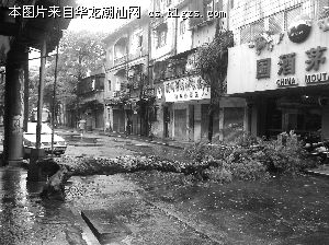 在强劲风力作用下,市区永平路与五福路交界处,一棵树龄逾40年的树木白千层轰然倒塌,8米长的树体横陈在永平路上,占据了整条道路(如图);中山路陵海市场附近,一棵种下四五年的大叶榕由于根系固定能力差,在大风中倾倒。接到情况反映后,昨天早晨,市城市绿化管理处工作人员立即前往现场,将倒树切割后清理运走,并在适合位置补种新的绿化树木。