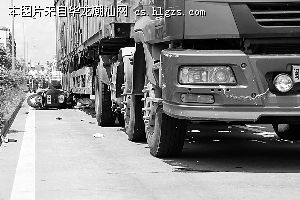 本报讯记者林晓彬、李德鹏摄影报道:今天上午10点半左右,市区东厦北路南香渔港前面路段发生一宗车祸,一辆集装箱拖头车与一辆摩托车发生碰撞,摩托车骑士当场死亡。