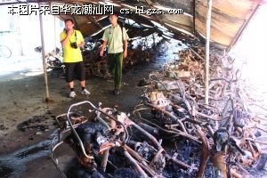 停车场铁棚已坍塌近百摩托烧剩铁架