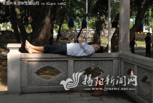 烈士纪念碑,是缅怀先烈的地方,本应庄严肃穆。但记者昨天巡城时,在市区榕江公园烈士纪念碑周围,却看到一位市民卧在石栏之上。