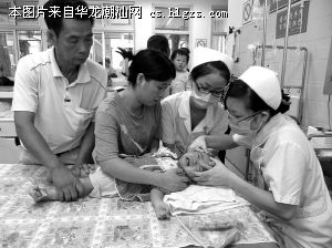 市中心医院急诊科医护人员告诉记者,从今年5月下旬开,到医院就诊的手足口病患儿就明显增加,5月30日一天急诊科应诊总数竟达到了403人,其中留院观察区患者人数有88人次,而儿科患者就有79人,其中绝大多数是手足口病患儿;而就在几天前,医院急诊一天收治了378名患者,其中儿科患者就多达144人这些惊人的数字让所有见多识广的医护人员都咋舌,因为该院急诊科留观区病床仅有27张,蜂拥而至的患者挤满了急诊科每一个角落,不仅走廊、过道都加满了床位,连医护办公室的桌椅板凳也都物尽其用,被腾出来当病床,即使这样也依然无法满足不断增加的患儿需求。我们有几名护士都已经累病了。急诊科护士长林振素无奈地告诉记者,近一个月来所有医护人员全部加班加点,有几名护士甚至坚持带病上岗,有护士家属只好偷偷给她打电话,哀求她给患病的护士放假看病。