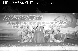 ①6月27日晚,汕头市庆祝建党90周年文艺巡演活动在濠江区双泉公园举行。活动以永远跟党走为主题,以庆祝建党90周年为主线,通过歌舞、曲艺小品、诗歌朗诵等综艺形式,歌颂建党以来辉煌成就和汕头建设成果。