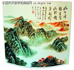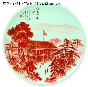 彩瓷作品《革命摇篮井冈山》,画面上是如波澜起伏的峰峦,画面下端是几面腊腊飘扬的红旗,画面的右上角仿毛泽东主席的书体刻录下他当年在井冈山写下的诗篇《西江月·井冈山》中的山下旌旗在望,山头鼓角相闻,由此突出了作品的主题。这件作品的作者是高级工艺美术师曾粮。一年前至今,他在江西省景德镇看护年迈患病的母亲,这件作品是他在母亲的病榻前抓住每一点可利用的时间来完成的。