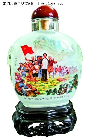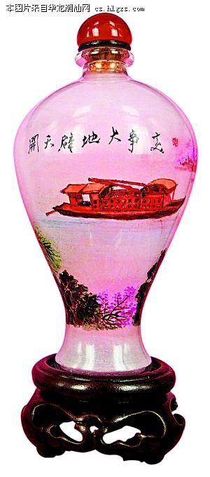 值得一提的还有工艺美术大师赖乙宁,他的献礼作品是水晶瓶内画《从三湾奔向井冈山》,取材于1927年毛委员领导秋收起义,而后在三湾对起义部队进行改编,纯洁革命队伍,然后进军井冈山开创革命根据地的史实。小小水晶瓶内,方寸之间展现出一幅壮烈的革命历史画面,非大师手笔不能为之。他的儿子赖斯佳也拿起反勾画笔,创作了玻璃瓶内画《南湖红船》,画面寓意中国共产党从南湖红船发端,90年来乘风破浪,不断夺取新的胜利。