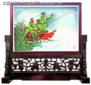 同样,用嵌瓷来表现革命题材,可能此前也是前所未闻。嵌瓷工艺师许少雄,根据当年叶剑英、贺龙、叶挺在鄱阳湖上乘船奔赴南昌参加南昌起义的史实,创作出《奔向南昌》的佳构,让人啧啧称奇。