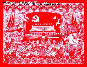 这批献礼新作有4件剪纸:许遵英的《党的光辉》,黄少琼的《举国同庆》,魏惠君的《和谐发展》,郑少燕的《福依党恩生》,各从不同的角度来歌颂党的丰功伟绩,反映各族人民载歌载舞庆祝党的90华诞的画面。丝丝入扣,艺术语言丰富。