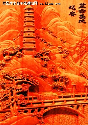 黄木亮的木雕作品《革命圣地延安》,精雕细刻,画面上突出延安的标志物——宝塔山,又用现在时的景物来刻写延安,寓意革命圣地延安,与时俱进,蒸蒸日上。