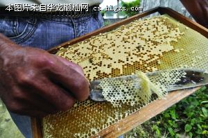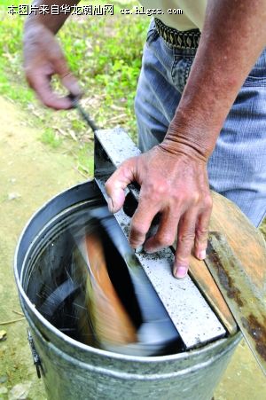面对蜜蜂的进攻,老陈毫无惧色,一脸轻松自如。将蜜蜂赶开后,巢框上露出了一个个六角柱状体的巢房,巢房里贮满了金黄色的蜂蜜。巢房上面有一层发白的东西,老陈介绍说,这层东西叫蜂蜡。老陈用了一把刮刀把这层蜂蜡轻轻地割去,再将巢框放进一个特制机器里,转动机器的把手,把蜂蜜甩出来。