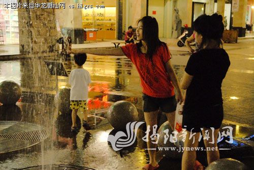 夏夜的街头喷泉旁,成为市民避暑的好去处。