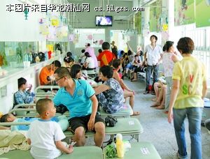 记者走进汕大医一附院急诊室,一眼望去全是打点滴的患,小孩子的哭闹声此起彼伏。一位母亲焦虑地告诉记者,孩子昨晚突然发高烧,连夜送来急诊。医院儿科急诊翁医生介绍说,近段时间来,小病号明显增多,正常时候每天儿科急诊只接诊五六十名患儿,近期每天急诊接诊的患儿多达100来名,患儿以五六岁幼儿为主,表现症状主要是发高烧、喉咙疼痛、流口水等,经诊断多为手足口病、疱疹性咽炎,病情基本都为轻症。医院儿科急诊一天只有两名医生分上早晚班,每天都是超负荷工作。