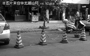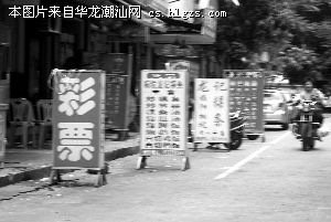 相对于水泥墩、花盆、破凳子等等诸如此类的路障来说,龙华街的这处路障堪称一举两得,商家把自制广告灯箱堂而皇之地摆放在商铺门前的停车位上,既阻碍了别人在此停车,又达到招徕生意的目的,真是别出心裁啊!