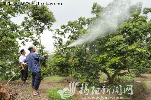 全国面积最大的“三棱榄”种植基地揭西县天鹅湖果林场,全面加强果树的科学管理,今年“三棱榄”果多粒大,丰收在望。针对近期高温天气,他们积极为果树保湿降温,确保果树顺利生长。图为技术人员正在为“三棱榄”树喷水降温。 林生惠 李维照 摄