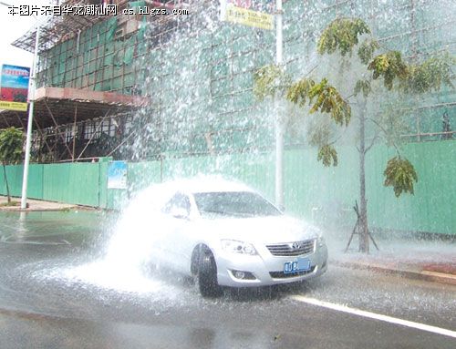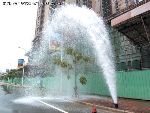 昨天下午1时许,记者接到报料赶到黄山路与金砂东路交叉处附近路面时看到,一个消防栓掉落在地上,从消防栓安装处喷出的水柱有5米高,附近路旁出现长约100米的积水地带。不时有过往车辆直奔水柱下路面,享受免费洗车。