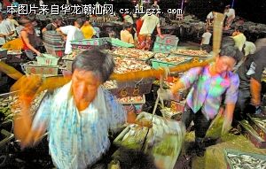 自南海休渔期结束,惠来县神泉镇澳角村的渔民纷纷出海打渔。天还没亮,码头上人声鼎沸,喧哗震耳,两三千人在渔村码头的鱼市上拥来挤去,汇成一片喜获丰收、兴奋欢快的情景。码头边停泊着几十艘大船,人们正兴高采烈地把一筐筐的鱼抬上码头。马卡摄影报道