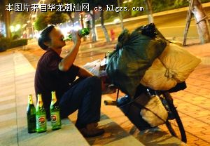在西堤路尾轮渡码头附近的草坪上,也有一些人在上面铺了一层草席就呼呼入睡做了春秋大梦,他们或许是因家里狭窄酷热难耐而借宿街头,也或许是无家可归的拾荒者。C石桥边,候客的出租车司机围聚一起侃大山,每当有准顾客走过,他们马上开口招呼。在路旁的台阶上,一名踩着单车的中年男子孤独地坐着,身边摆放着几瓶啤酒,不知道他是饮酒消暑还是借酒浇愁。