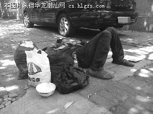 昨日上午10时左右,天气炎热,地面温度特别高。记者来到大华路与红领巾路交界,在路口附近的大华路上的一处树荫下,记者发现了这名正在酣睡的流浪者。该流浪者是一名男性,身穿黑色长衫长裤,脏乱的头发搭在黑黝的额门前,身上散发着阵阵的臭味。他的身边放着三个装得满满的黑色塑料袋、一个白色空碗及一瓶饮料,旁边还放着饭菜和馒头。