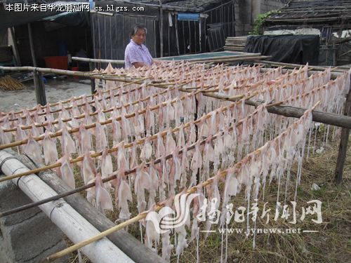 为期两个半月的伏季休渔结束,8月1日开捕以来,惠来县神泉镇的渔民出海捕捞满仓而归,捕获了大量的鲜鱿鱼。近期,当地渔民除了将大部分鲜鱿鱼卖给渔贩外,也将剩下的鲜鱿鱼清洗干净后挂在竹棚架上,晾晒成鱿鱼干出售。通讯员 郑文德 摄
