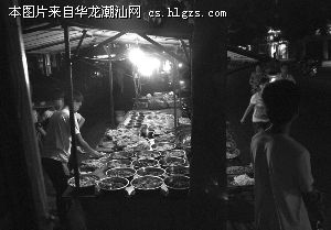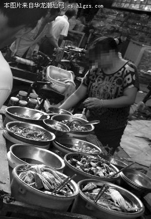 近日一个晚上十点多,记者在长平路梅园一带看到,马路两旁有许多夜粥摊档,大大小小的摊档加起来就有数十家。大排档的推车上摆满各类海鲜,生腌制品根据不同种类分别装在不同的铁盘里。比较常见的腌制海鲜有螃蟹、扁蟹、三目蟹、血蚌、牡蛎、鲜虾、濑尿虾等。一名女店主告诉记者,这些腌制海鲜,加入了多种调味料起到杀菌作用,由蒜头、酱油、鱼露、味精、辣椒、芹菜等腌制而成。