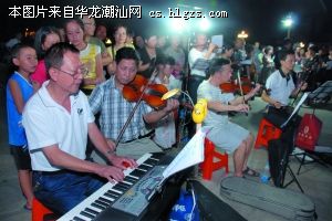 本周三晚上,人民广场上熙熙攘攘,最热闹的要数海蚶雕塑旁。现场灯火通明,20多名爱唱爱乐·激情广场演唱队的中老年人手捧着歌谱站在话筒前,在小提琴、电子琴、二胡等乐器的伴奏下引吭高歌。