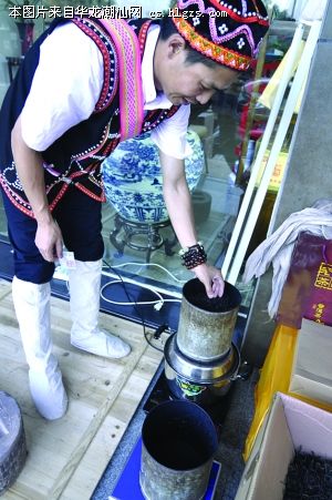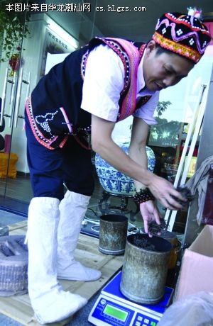今年34岁吴承峰,制作茶饼的时间已有21年,目前每年均在全国各地巡回制作澜沧古茶茶饼、推广古树茶文化。据吴承峰介绍,一块普洱茶饼从开始到制作成型,一般都要经过称、蒸、捻、压、拿、拨、包等七道工序,全个过程大约用时20分钟。在制作澜沧古茶茶饼时,则要采用精选过的古树茶叶为纯料,用纯手工蒸压而成,这比机械压制的茶饼,更具收藏意义和民族内涵。