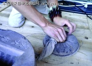 在吴承峰所有的制茶工具中,最吸引茶友的是一块重约24公斤的石磨,这是专门用来压制茶饼的工具。记者在现场看到,每次在压制茶饼时,他总是要站在石磨上边,利用身体和石磨的重量,来回绕圈、有节奏、均匀地使力压制茶饼。吴承峰说,要掌握一个茶饼压得好不好,就是要从内心去感受它,考虑要怎么去把它压好,这样压出来的茶饼,才能达到很好的标准。