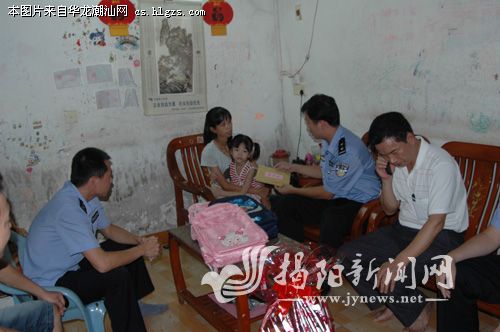 日前,东山区龙石村贫困户陈耿姗家迎来了一批客人——来自揭阳市公安局特警支队的民警。他们为三个孩子送来了学习用品和助学慰问金,为这个一贫如洗的单亲家庭带来了温暖和希望(见上图。通讯员 摄)。