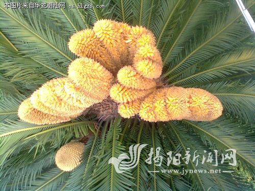 苏铁,雌花雄花均生于干顶,雄花顶生成圆锥形,雌花半球状,头状花序。图为市机关办公大院后的花圃中,开着奇异花朵的铁树。