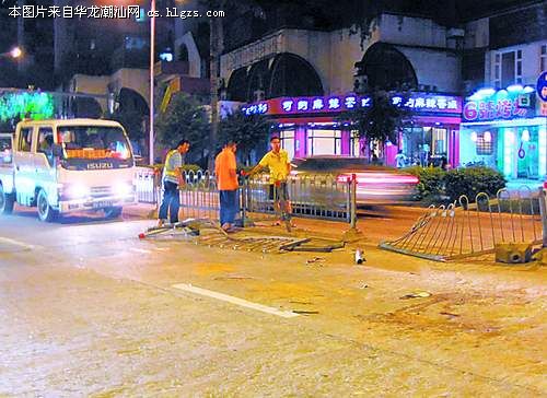 记者在现场看到,维护人员已经在现场清理受损隔离栏,其中不少隔离栏中间的圆柱散落。据了解,受损的隔离栏一共有6节,其中大部分都受损严重(见图),地面用于固定的水泥桩被撞开了。