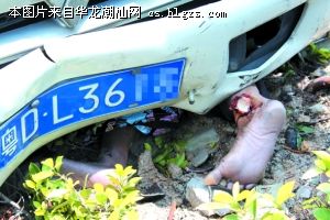 昨天上午11点半,记者接到报料后赶到车祸现场,只见一辆挂着本地车牌的白色小型货车停放在该十字路口的绿化带旁边,货车的车底下有一辆男式摩托车和一名中年男子,该男子已经死亡,头部被夹在前方车轮处,双脚被压在绿化带上,其中一只脚的骨头外露,地面上有不少的血迹。而在货车周围,散落着一双黄色拖鞋、一个篮球和一个摩托车后尾箱。