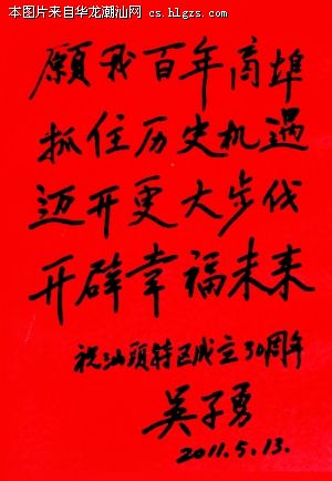 笔杆子很硬的吴子勇对军制学的研究是位行家,解放军军事科学院军制部的头衔让人对这位少将级的人物肃然起敬,34年的枪杆子生涯练就了他浑身的军人气概。不过,当人们对这位毕业于北大中文系的书生怎会当上个武生有些疑惑时,吴将军却笑哈哈地说,这纯粹是历史的选择,但我无怨无悔。他经常出现在一群激情四射的北京潮青里,与年轻人在一起,将军说他年轻了10岁。无论走到了哪里,梦里故乡,心涛依旧。他说,还是家乡汕头最好——