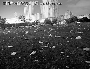 本报讯记者黄泽群、黄鸿华摄影报道:昨天晚上,大批市民来到户外赏月,到处是摩肩接踵的人群。但是在赏月的同时,许多市民却将垃圾随处乱丢。广场上,大量的塑料袋、果皮、纸屑堆积,一片狼藉。