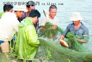 记者看到几个村民身穿雨衣,身体一半浸泡在池塘里,沿着池塘边拉着网往池塘内收,随着渔网越往里收,渔网越来越沉,收网的阻力越来越大,不时还有活蹦乱跳、银光闪闪的鱼跳出水面逃走,哇,又逃掉一尾,虽是可惜,但是村民脸上仍泛着笑容。渔网收回来后,几个村民围到一块将渔网拉成几格,将不同品种的鱼进行分类,并将一些较小的鱼放回池里。捕上来的鱼非常肥美鲜活,重的达十多斤。下午四五点,鱼贩将车开到池塘边收购新鲜的活鱼,销往店市等附近的市场。