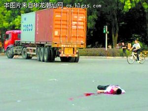 本报讯记者林晓彬摄影报道:今天上午6时30分,在市区金砂东路和天山路交界处,一辆集装箱货车和一辆女庄摩托车相撞,摩托车男骑士当场死亡。据目击者介绍,当时集装箱车在天山路自南往北走,在金砂东路口左转拐入金砂东路,一辆在金砂东路自西往东行驶的摩托车由于车速过快撞上集装箱车车尾,摩托车飞出20多米,摩托骑士当场倒地不起。6时40分左右,120救护车赶到现场,经医护人员诊断,摩托车骑士已经没有生命迹象,当场死亡。随后,交警也赶到处理事故现场。