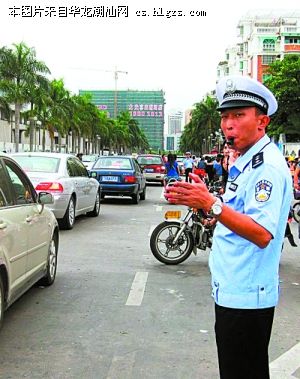 记者在现场看到,陈英峰和林吉荣站在路上边吹哨子便做着指挥手势(见图),指挥过往车辆尽快通过,并对个别停放在附近路段揽客的不自觉出租车进行警告,责令驾驶员立即驶离现场。感觉累吗?记者问。陈英峰答道:当然累,但这是我们的职责,再说我们也习惯了。今天路面总体情况不错,高峰期的车辆通行速度会缓慢些,但没有出现严重拥堵。
